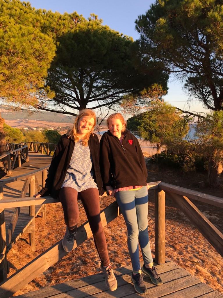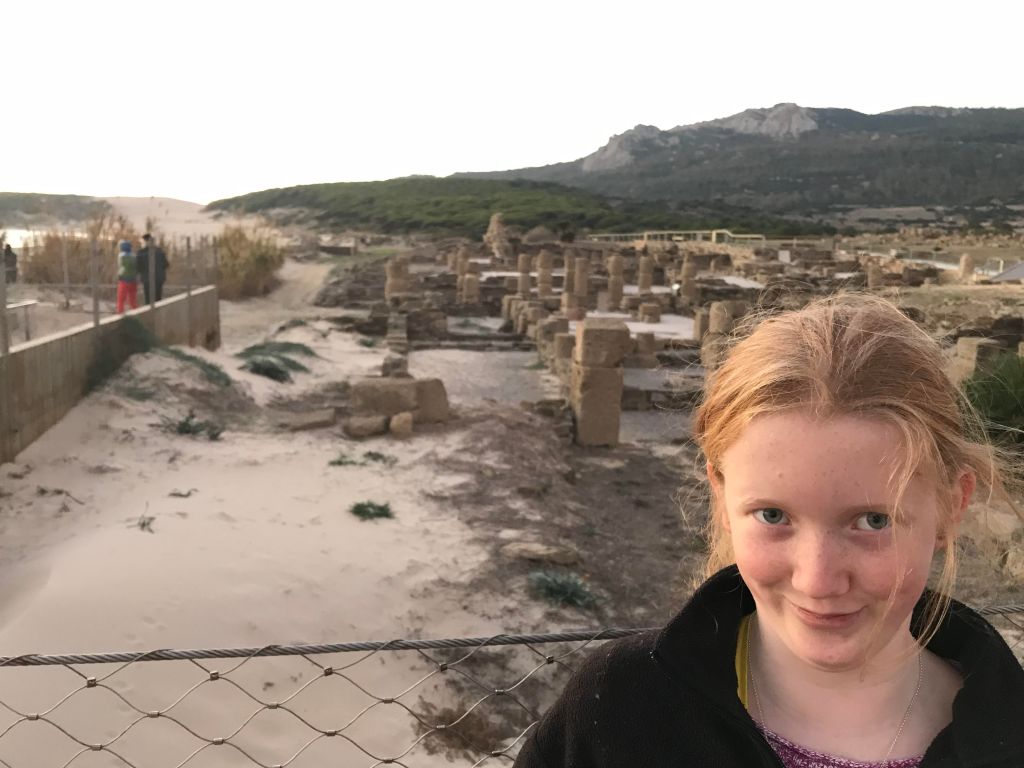 We spent a few hours walking on the beach, playing in the sand and climbing on the rocks. Visible in the background of the photo just above is a World War II machine gun bunker and watch tower, now covered in grafitti. After our walk we drove over to the nearby town of Bolonia, which had an even less developed beach and which was also the site of a Roman settlement. Bolonia gets a strong wind that has formed some nice smoothed-top pines and also built up a huge dune that is migrating slowly eastward. There’s also boardwalk that runs behind the smaller dunes. From there we could see Morocco across the water, looking like a mountain range along the horizon line.