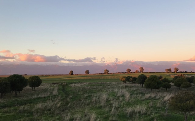 The train between Madrid and Sevilla takes only 2 and a half hours and is very comfortable. Good WiFi, great views. But the drive home through Extremadura, although it takes twice as long, is even more beautiful. As you can almost see in the photos below, the snow-capped peaks of the Sierra de Gredos are faintly visible across the fields.