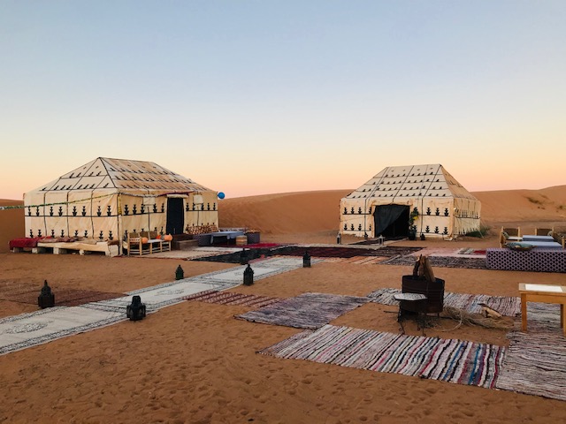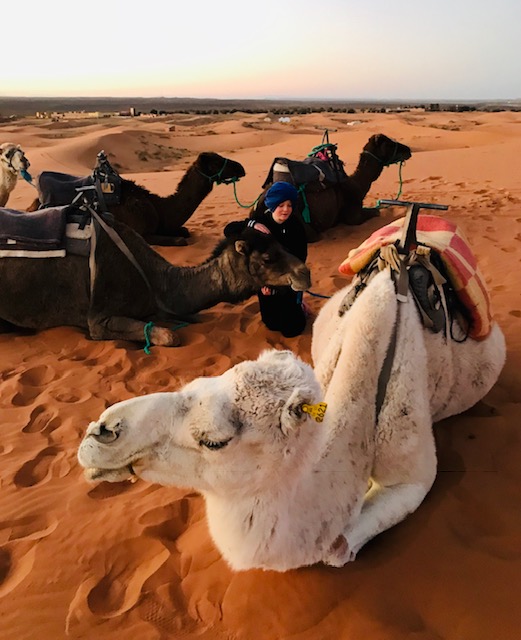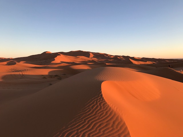 After Fez we spent two cold but beautiful nights in fancy tents in Erg Chebi, a large sea of dunes formed by blown sand from the Sahara. The sand was a lovely reddish color, and the first night we rode camels out into them to watch the sunset. Our tents were on low platforms; they had carpets on their floors, and beds, and were tall enough to stand up in and with smaller bathroom tents off their sides. Very comfortable.