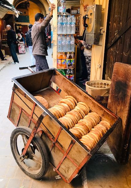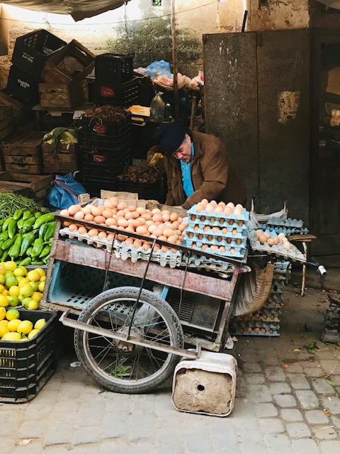 I loved how lively the streets were, and how much small scale commerce there still is. It’s not at all corporatized: no chains, no supermarkets, no brand-name retailers. Instead there are butchers, fruit sellers, egg sellers, olive sellers, iron workers, comb-makers, shoe makers, bakers and weavers. Each of the dozens of small neighborhoods in the medina still has now — just as it has had for centuries — its own hammam (or communal bath), public water fountain, community oven for baking bread, plus school, mosque and carpenter.