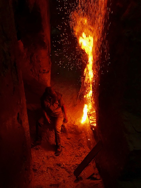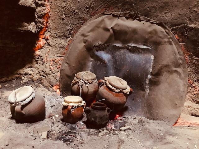 On the first day we again had a guide for a few hours, who again walked us hurriedly past monuments and to the famous Place Djemma El Fna, filled with food carts, acrobats, snake charmers and water sellers, all catering to tourists. The one special stop we made with him was a below-ground brick oven used to heat water for the hammam, where the oven is fired by a man who sits all day feeding wood chips into it. He let us come down and see the oven and also the clay pots that he has balanced against it, cooking tagine-like dishes for the neighboring households.