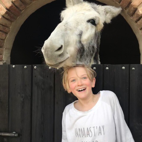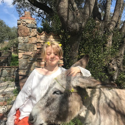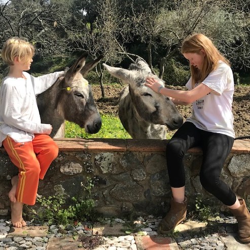 The donkeys were usually kept just down the gravel path that followed the river — the “ruta de las molinas” or route of the mills — from where we were staying, in a brick and stone stable with high wooden doors. We stopped to visit them twice and they seemed to appreciate the company. And sometimes during the day they would be put out to graze in a nearby pasture behind a stone wall, so Benji, Ibby and Mimi made flower crowns and communed.