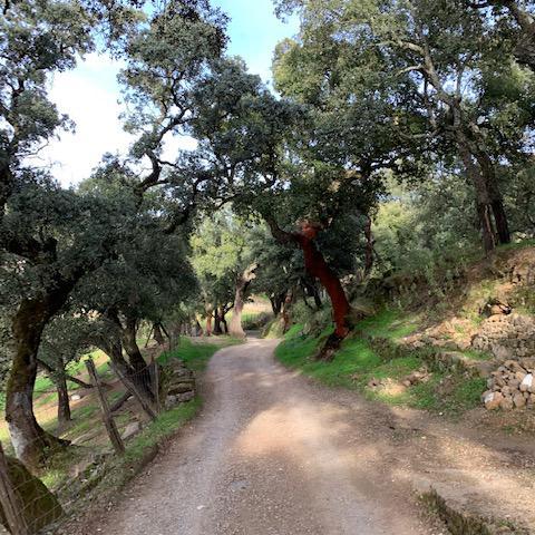 On a few long weekends this winter we drove up to the northwest of Sevilla into the mountains known as the Sierra de Aracena. After we cross the Guadalqivir River we drive through fields of sunflowers, alfalfa, wheat (ok I’m guessing on the wheat), and through vineyards and acres and acres of olive trees, and then after about an hour we are in hilly terrain covered in oak and cork trees, grazed by cows, sheep, goats and the black-footed pigs.