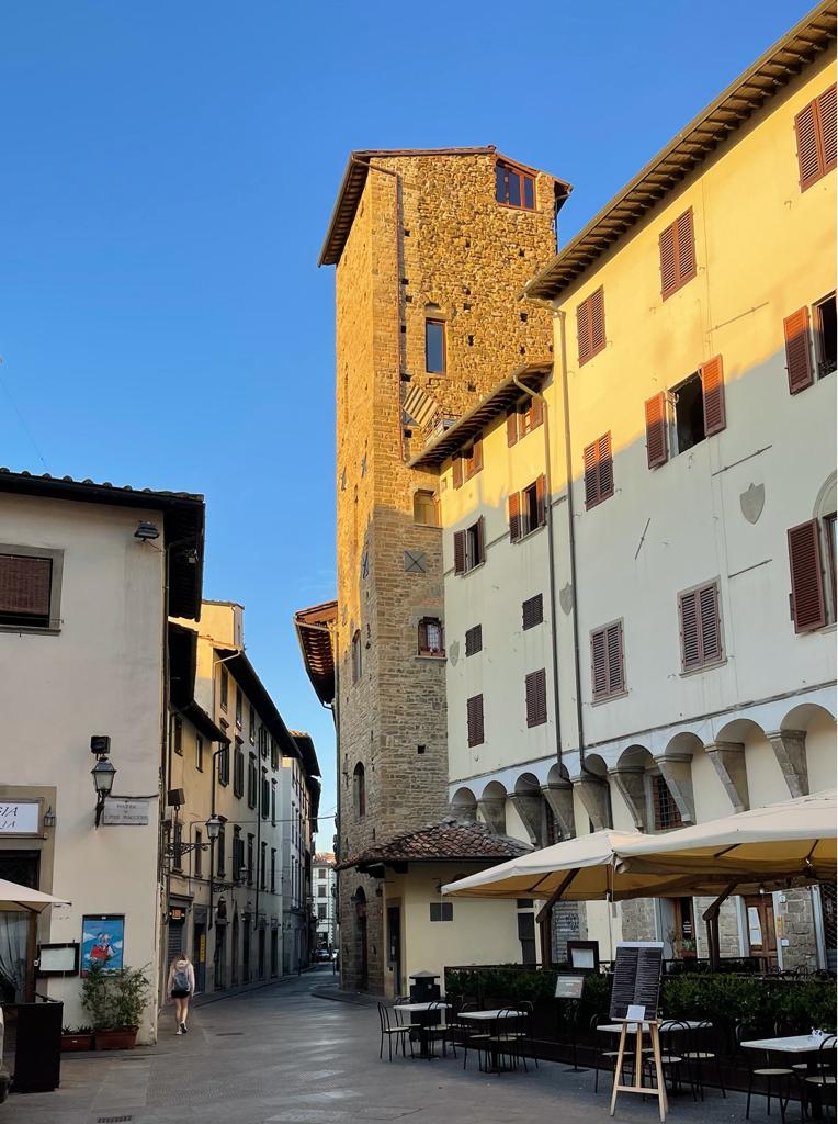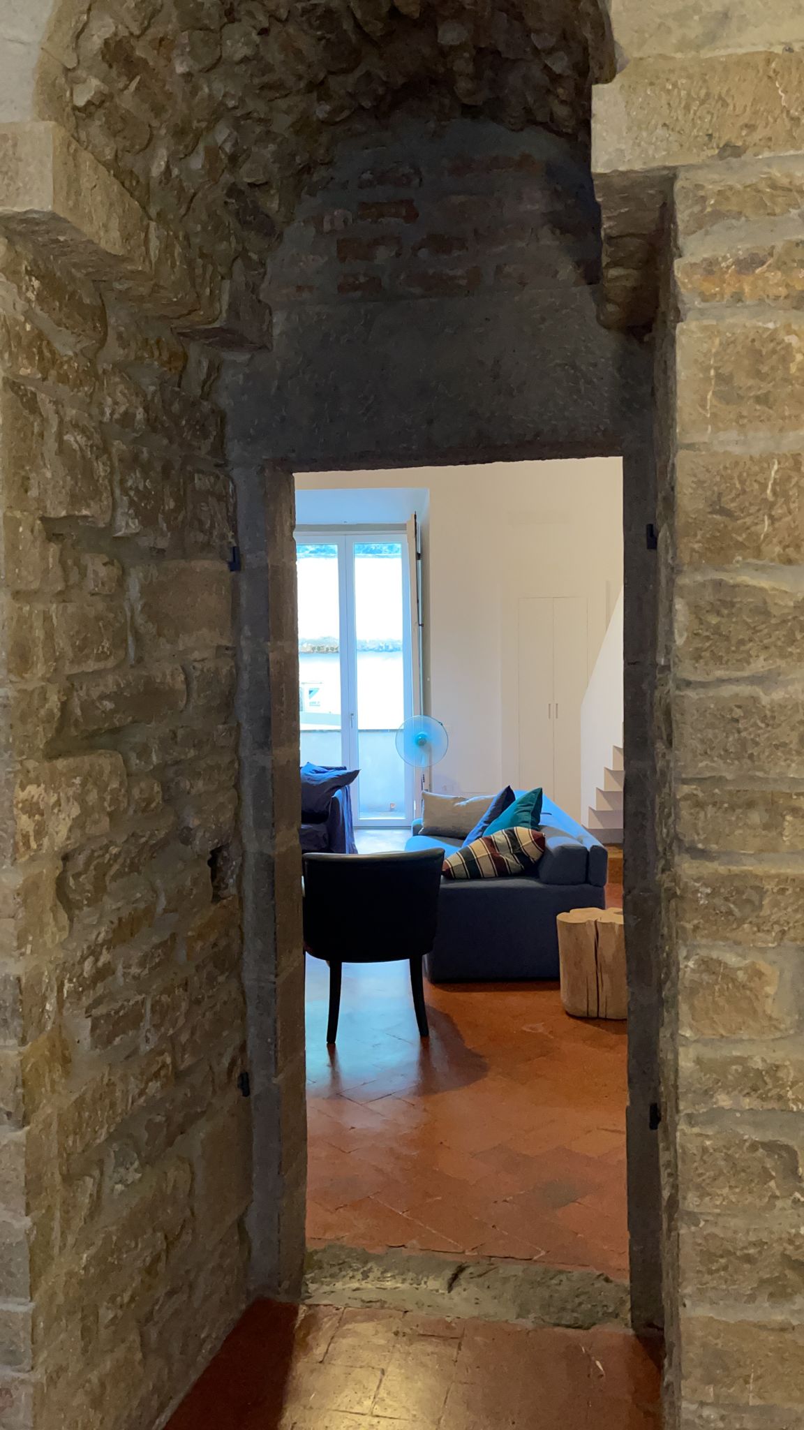 Our own short-term rental apartment was not too far away, in an old stone tower from approximately the 16th century. It had thick walls and vaulted ceilings, but with a modern kitchen and bathrooms. Below are photos showing an interior wall and part of the living room, the tower as seen from the piazza and the view of the piazza from our front door.
