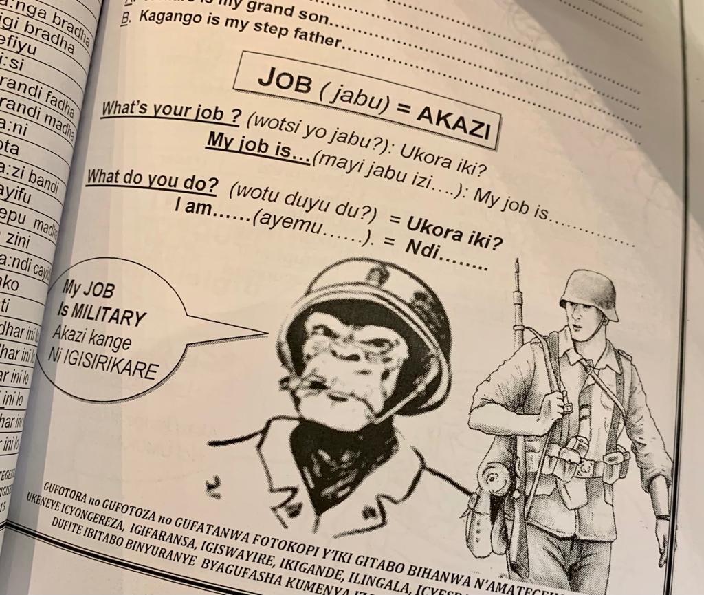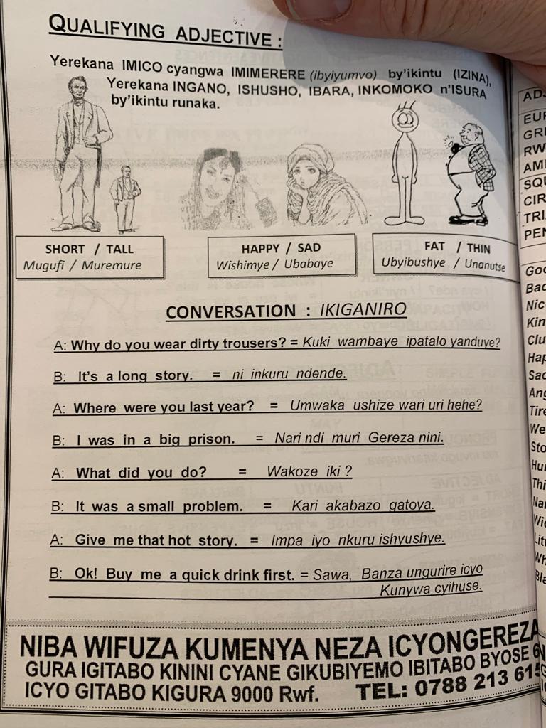 As I passed one of the larger buildings on my way back to the hotel, a news vendor in a blue apron rushed up to me, making persistent, rapid-fire offers of old magazines, used daily papers and laminate-cover language learning books. I wasn’t interested in buying a 6 month old Economist, but a clean escape seemed unlikely so I chose a homemade English instructional manual for Kinyarwanda speakers. Score! The book is full of delightfully weird phonetic spellings and even stranger suggested English dialogues. “Give me that hot story!”
