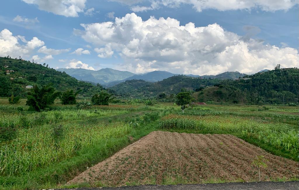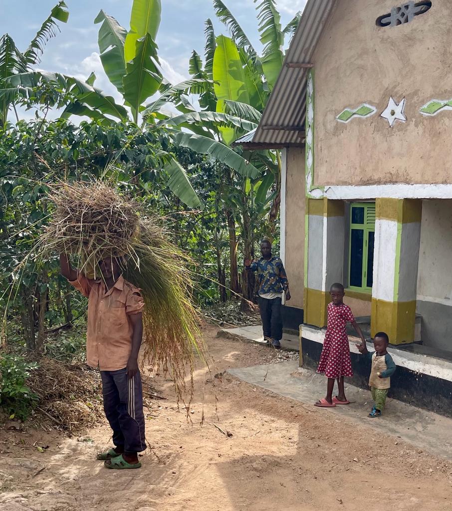 The main roads out of Kigali are smooth and look recently paved. High-tech speed cameras are arranged every few miles, but once we left the city area we saw almost no cars. Instead there were many people walking on or beside the road with sacks of animal feed, yellow jugs of oil or water or fuel, or buckets of fruit or cassava on their heads. There were more people tending the goats and cows tethered everywhere on the shoulders of the road, taking advantage of the grass that grew there.